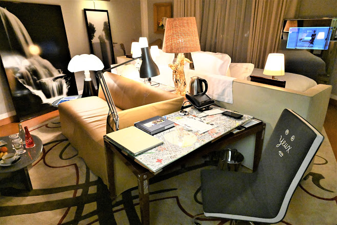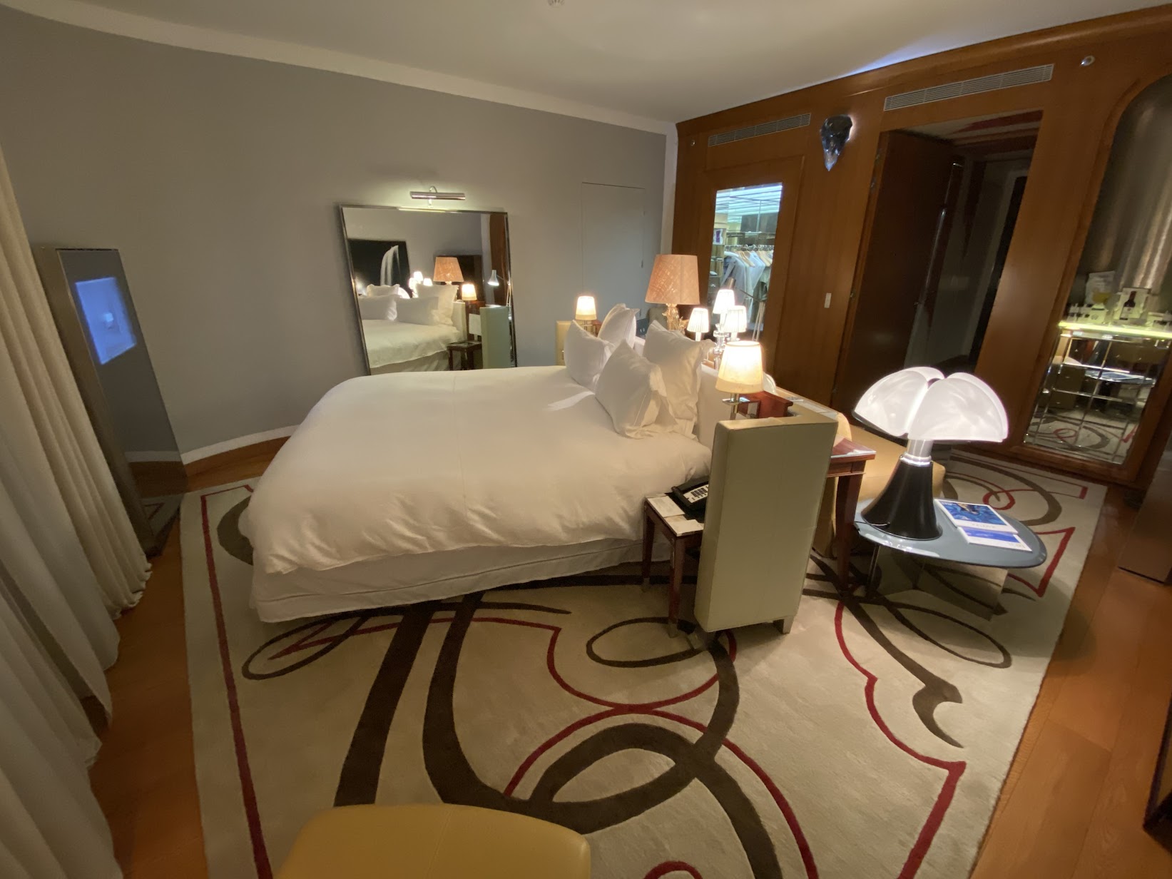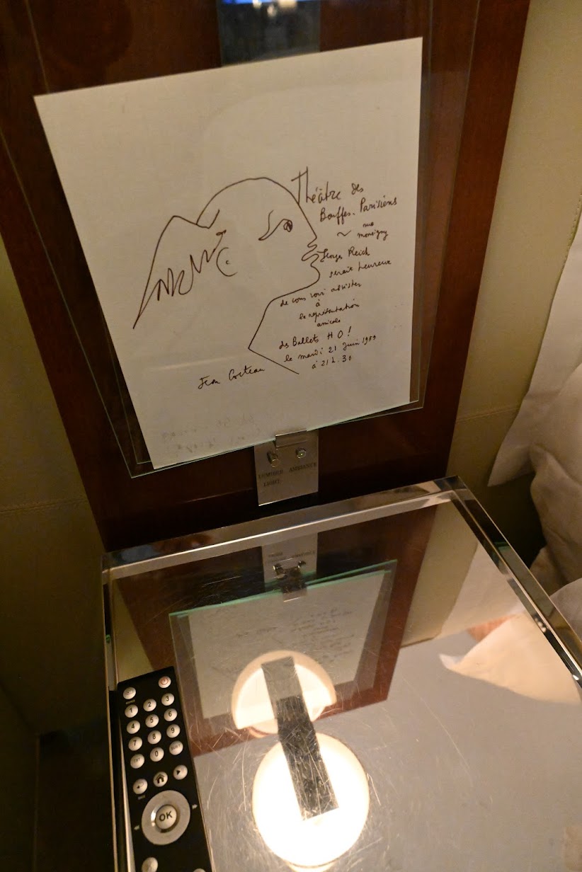 客室は芸術家ジャンコクトーの書斎をイメージし、ベッドが部屋の真ん中に鎮座する。